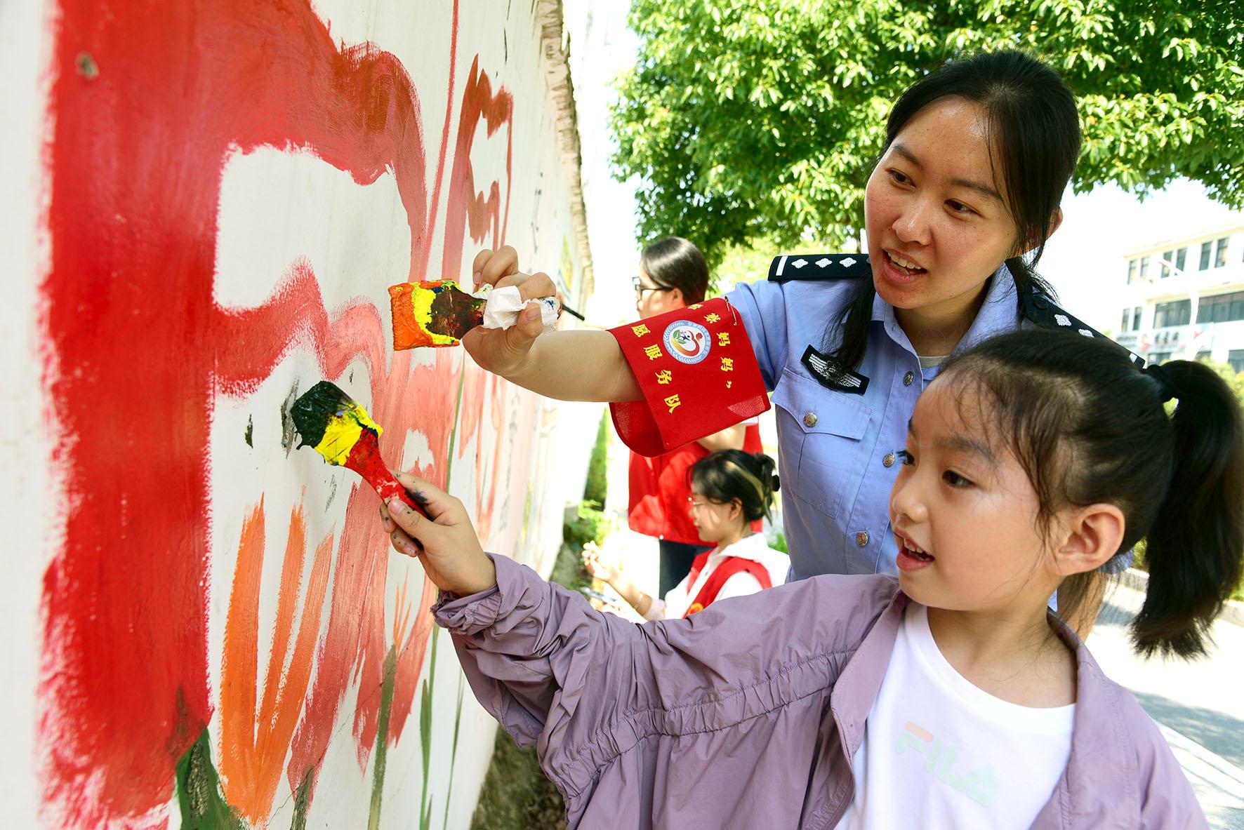 6月25日,在江蘇省鎮(zhèn)江市寶平社區(qū),江蘇大學(xué)志愿者、官塘派出所民警和小朋友一起描繪“禁毒文化墻”。