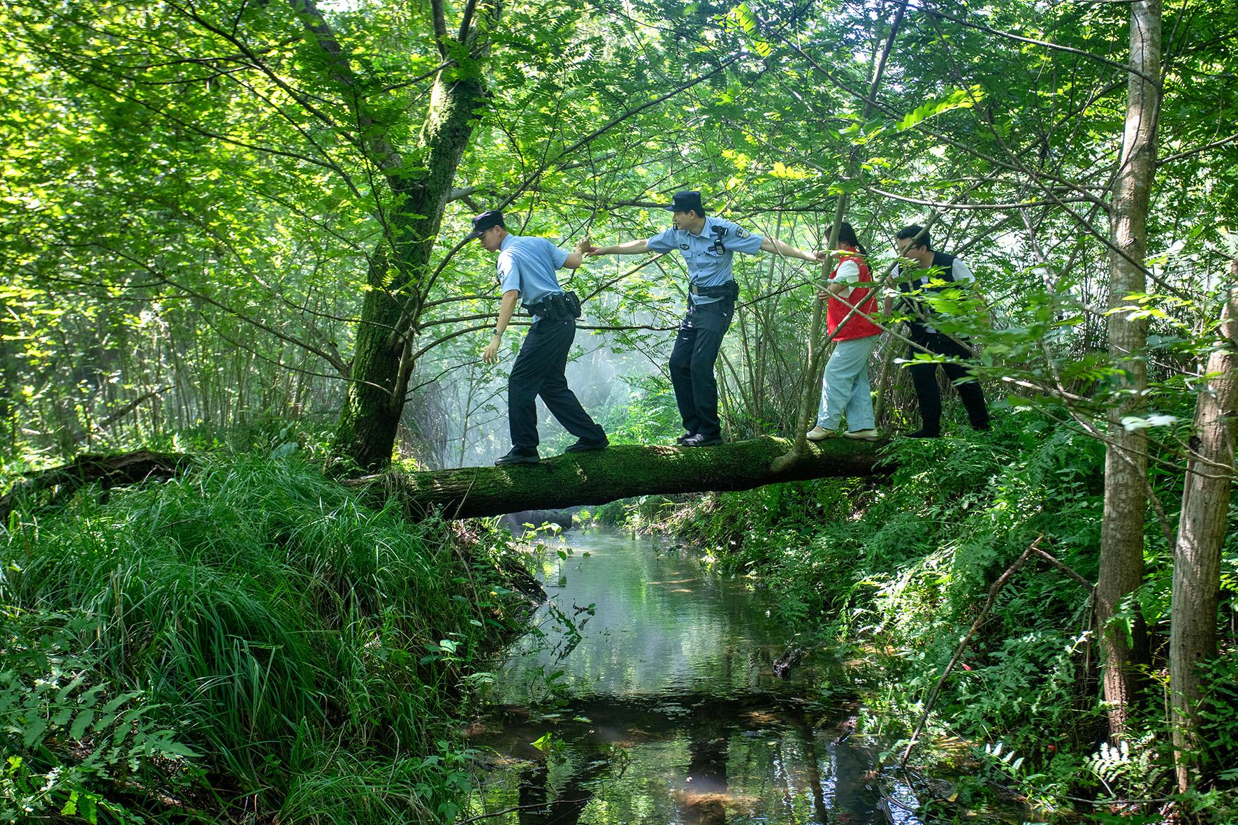 圖為6月27日,北洋派出所長潭生態(tài)警務(wù)室民警和志愿者一起在白鷺灣濕地公園巡查。