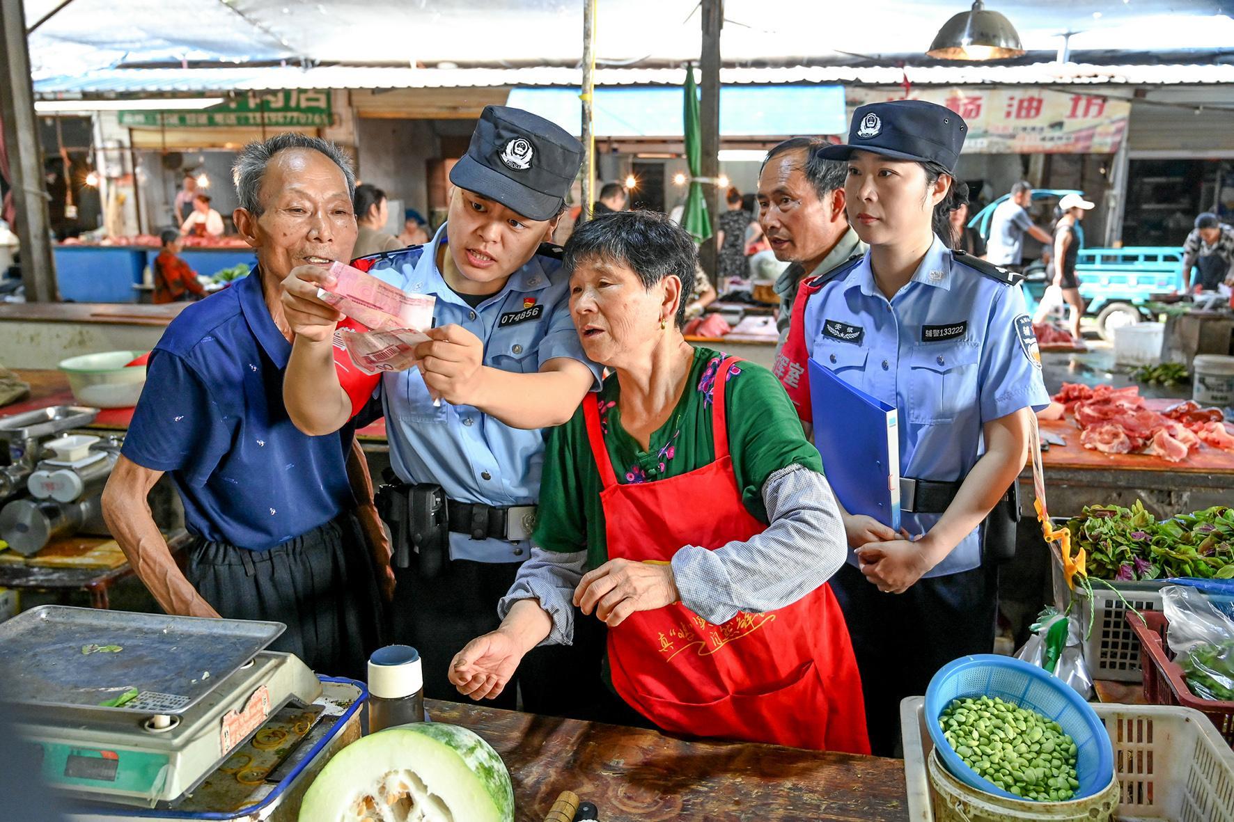 7月4日,安徽省馬鞍山市和縣公安局經(jīng)偵大隊(duì)民警在農(nóng)貿(mào)市場向群眾開展識(shí)別假幣宣傳,通過傳授“一轉(zhuǎn)二摸三透光”小妙招,提升群眾識(shí)假能力,筑牢安全防線。