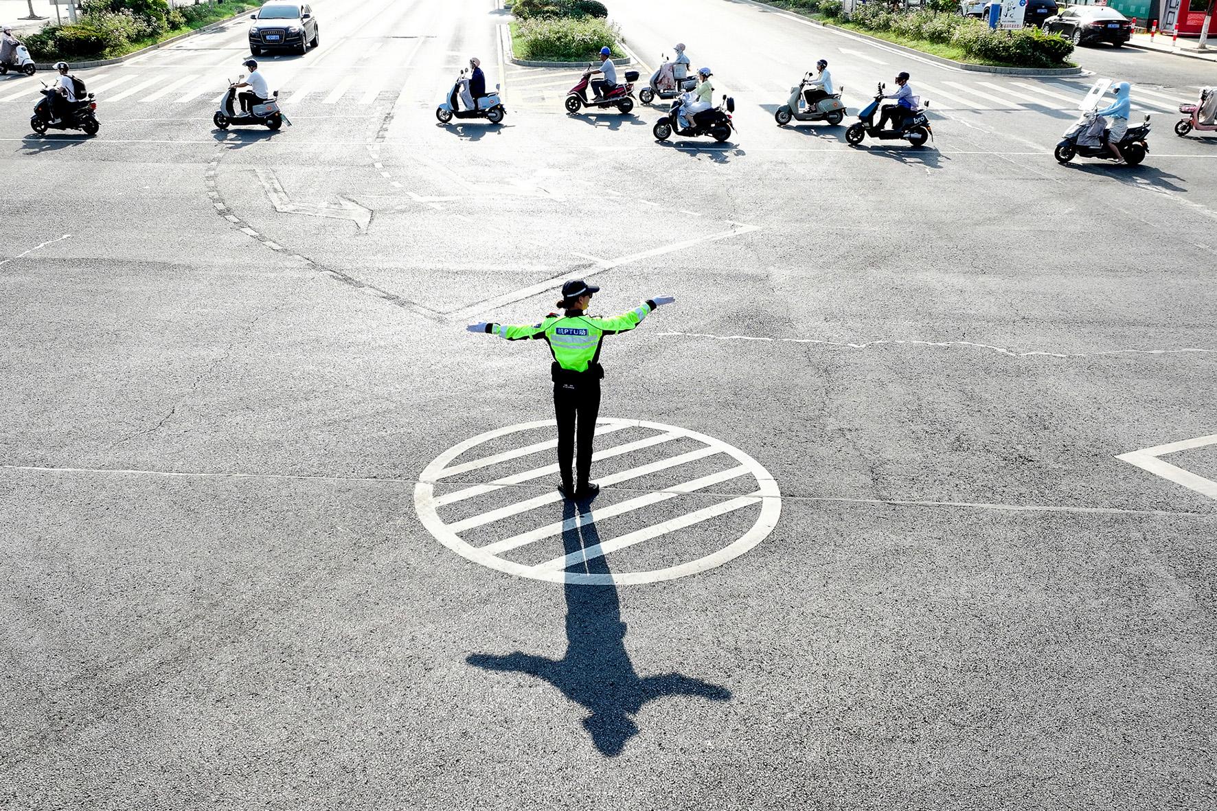 7月7日,安徽省馬鞍山市和縣公安局交警大隊民警在烈日下指揮疏導交通。