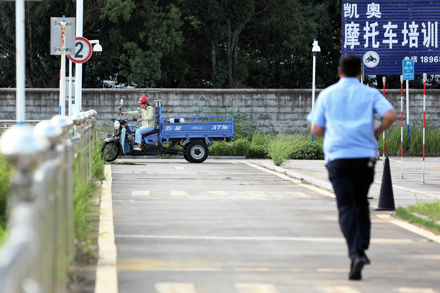 7月4日,安徽省寧國市公安局交通管理大隊車輛管理所民警輔警在高溫橙色預警天氣下堅守崗位,持續(xù)為摩托車駕駛學員們提供駕考服務(wù)。