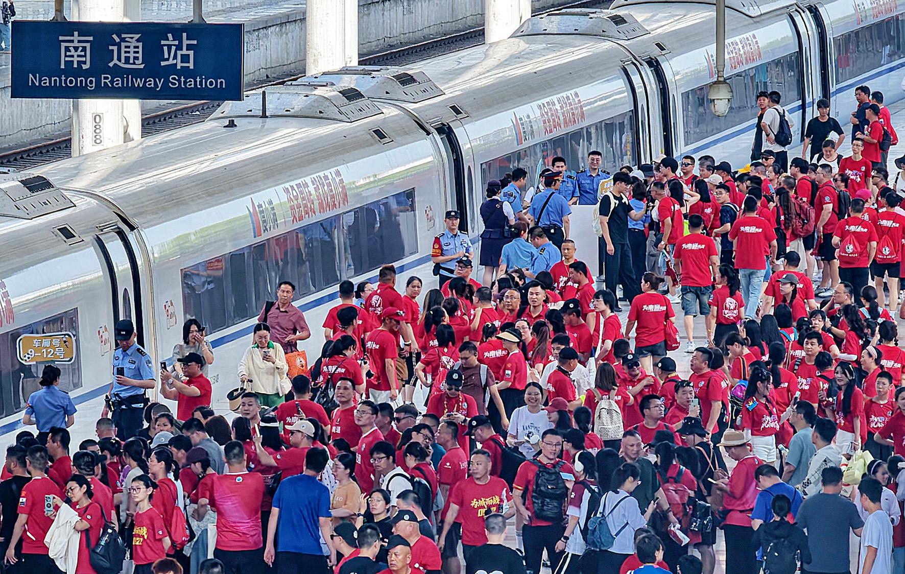 7月5日,為確保G9296次“球迷專列”運(yùn)行安全,南京鐵路公安處南通站派出所精心制訂安保工作方案和應(yīng)急預(yù)案,增派警力在南通火車站“球迷大巴”落客區(qū)、候車區(qū)、站臺(tái)等重點(diǎn)部位筑起守護(hù)防線,護(hù)航千余名球迷安全乘車看“蘇超”。