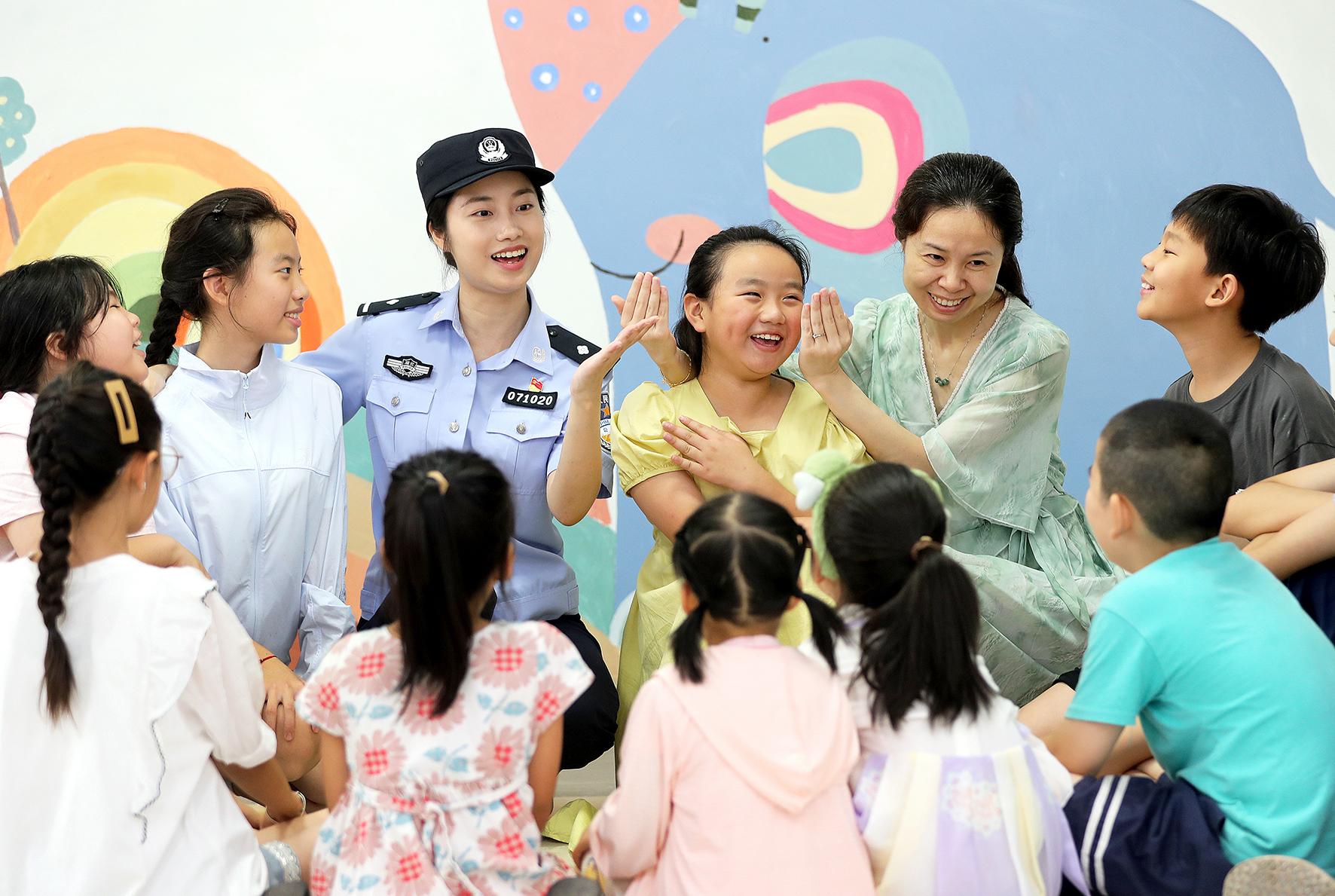 7月9日,湖北省荊門市公安局高新區(qū)·掇刀區(qū)分局民警在幸福社區(qū)“愛心托管班”,向轄區(qū)產業(yè)園企業(yè)員工子女開展防拐防騙安全教育宣傳。