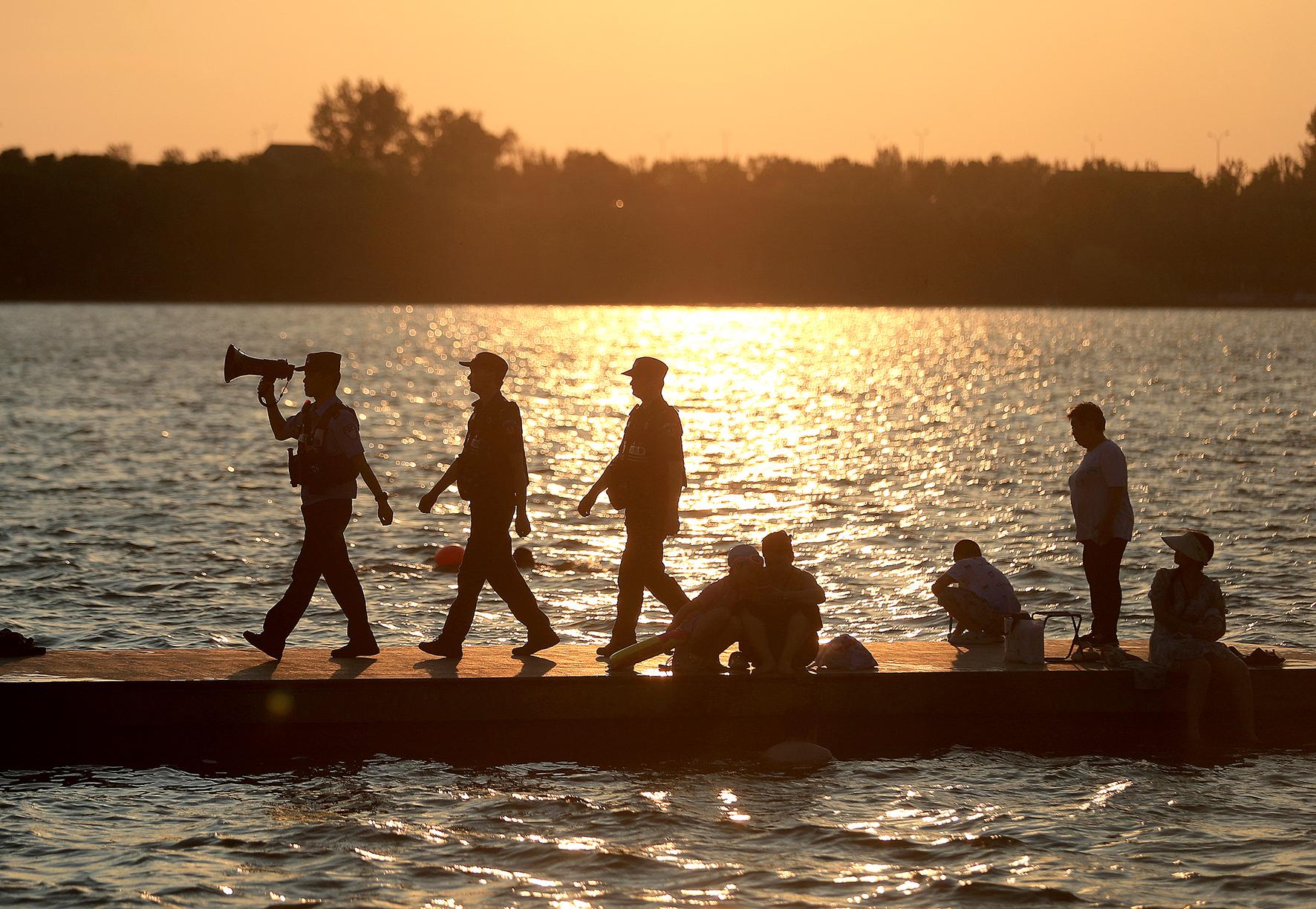 “水深危險(xiǎn),請(qǐng)勿游泳!”7月28日傍晚,湖北省荊門市公安局巡特警支隊(duì)生態(tài)運(yùn)動(dòng)公園警務(wù)站民警,手持喇叭沿鳳凰湖岸勸離野泳群眾。