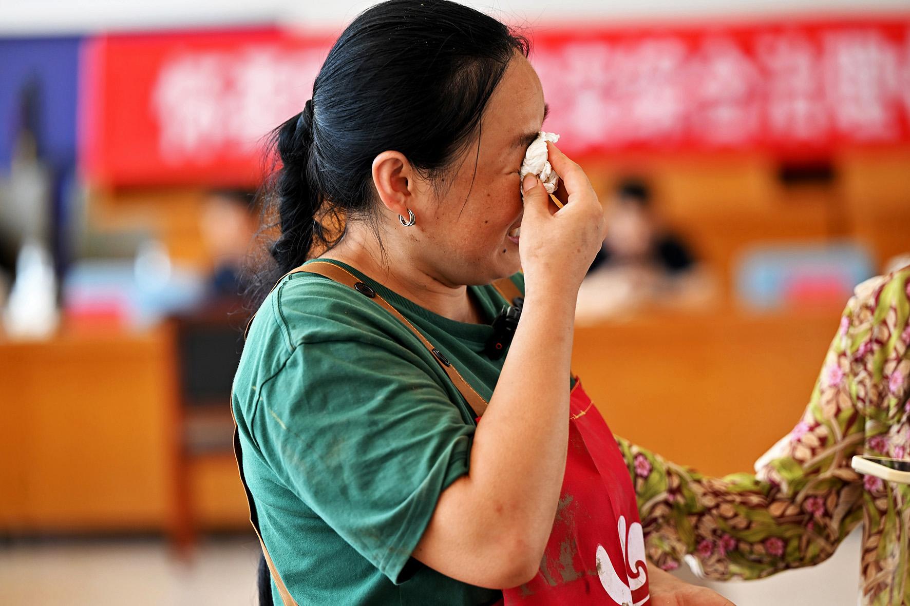8月4日,北京市懷柔區(qū)學(xué)生軍訓(xùn)基地安置點(diǎn),懷柔區(qū)人民法院防汛小分隊(duì)成員、湯河口法庭副庭長(zhǎng)周科熱情地與來(lái)自楊樹(shù)下村的池大媽打著招呼。今年5月,周科帶隊(duì)去楊樹(shù)下村開(kāi)展民法典宣傳月普法活動(dòng)。