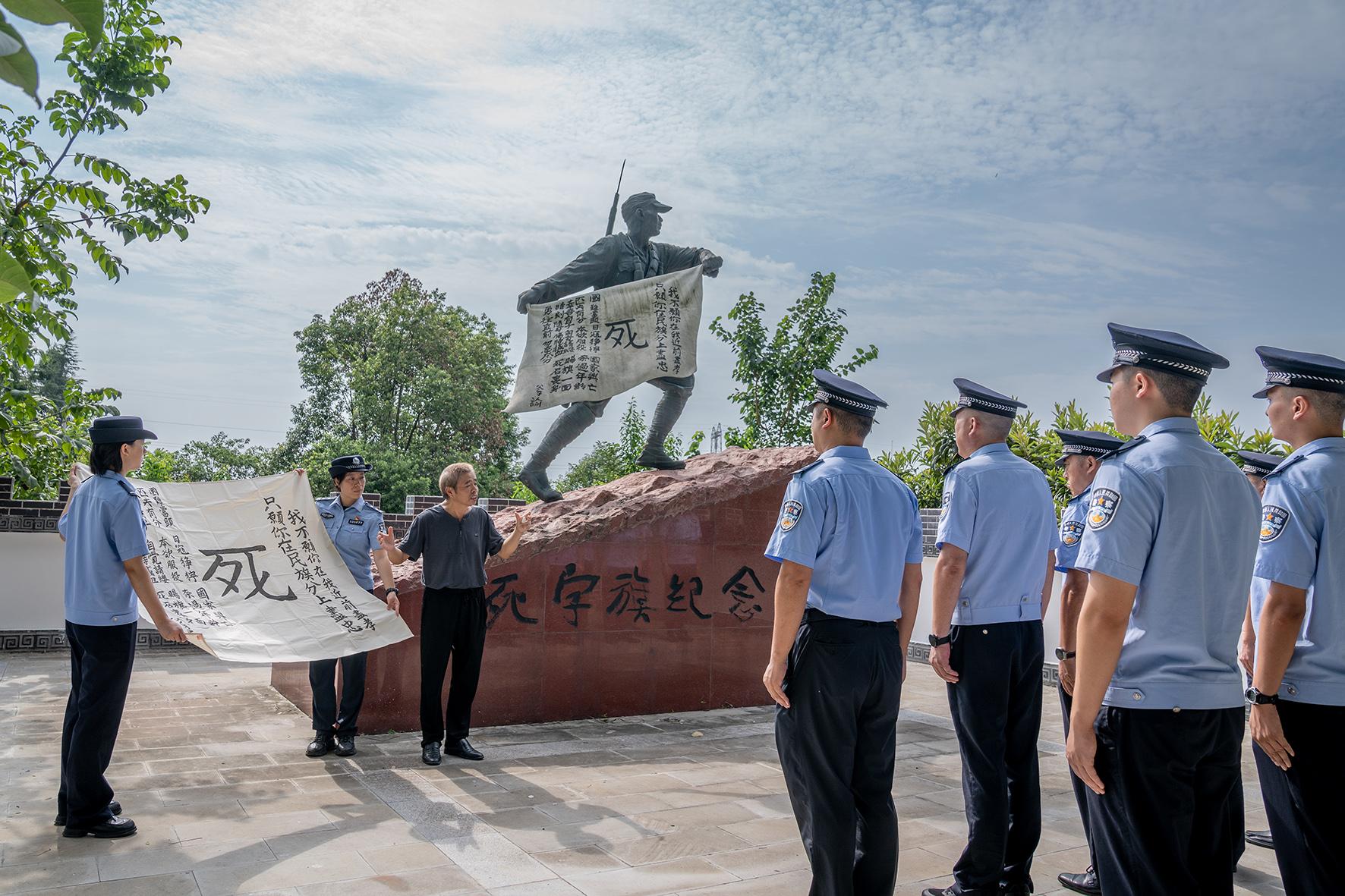 圖為在北川羌族自治縣安昌人民公園,“死”字旗主人王建堂的侄子王烈勛先生向民輔警講述“死”字旗的故事。