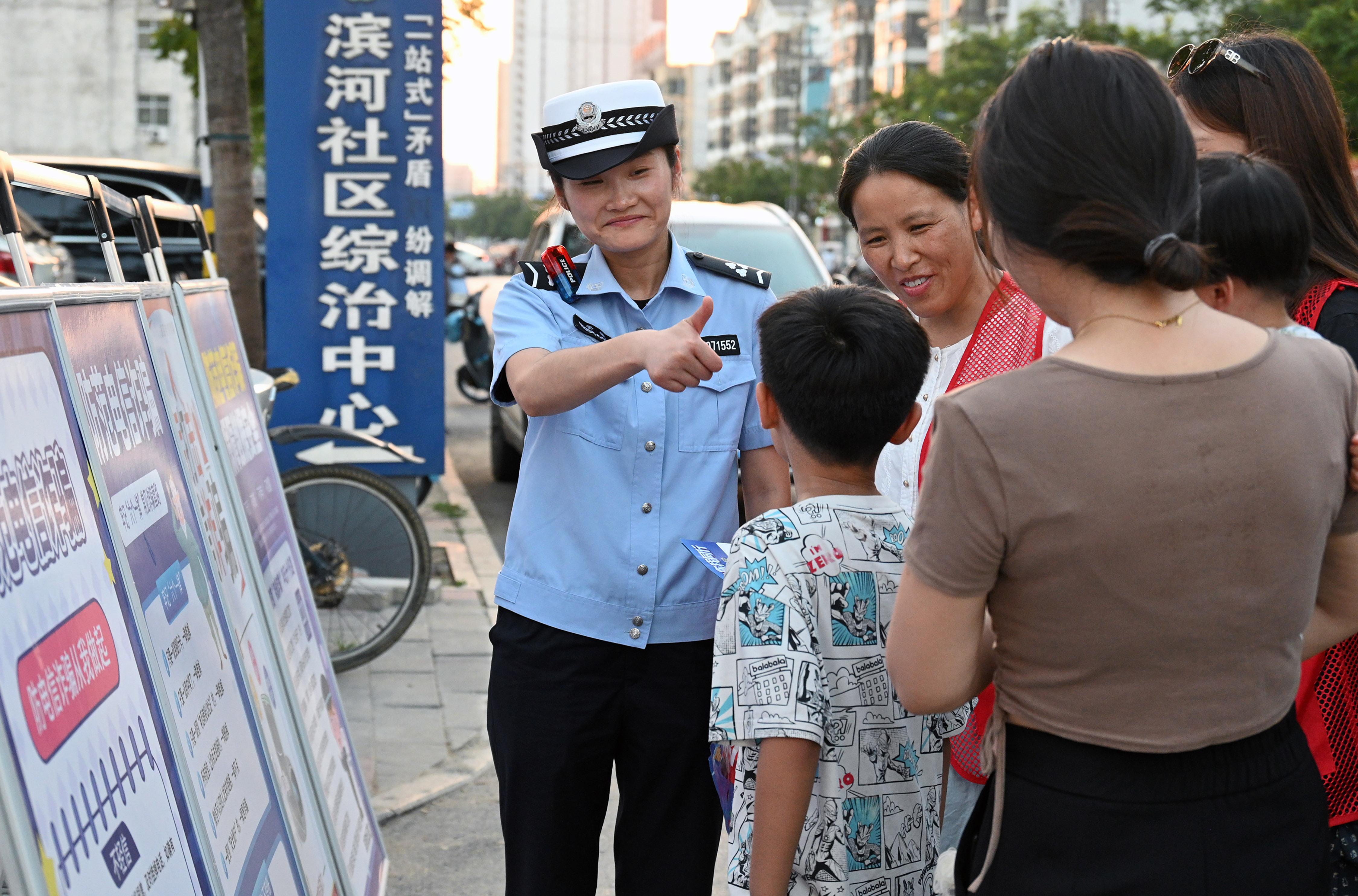 8月18日,安徽省固鎮(zhèn)縣公安局交管大隊輔警在濱河社區(qū)向居民普及安全防范知識。固鎮(zhèn)縣公安局創(chuàng)新探索“警街聯(lián)動”模式,聯(lián)合街道、社區(qū)開展交通安全、反詐宣傳和服務(wù)群眾等工作。