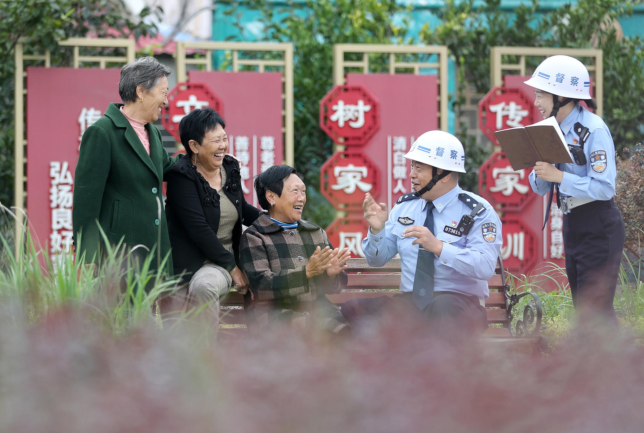 9月22日,在湖北省荊門市沙洋縣三峽土家族村,沙洋縣公安局督察大隊(duì)民警與村民“嘮家?!保瑑A聽(tīng)群眾對(duì)公安服務(wù)的需求與建議。
