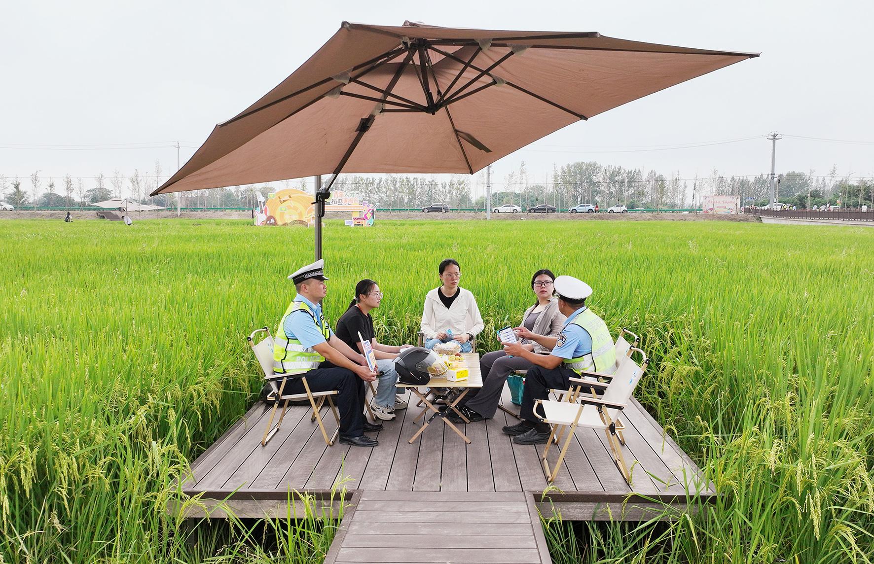 9月23日,安徽省蕪湖市公安局交管支隊(duì)鳩江大隊(duì)民輔警在“慶農(nóng)業(yè)豐收 享美好生活”2025年中國(guó)農(nóng)民豐收節(jié)活動(dòng)現(xiàn)場(chǎng),以拉家常的方式向群眾宣講交通安全知識(shí)。