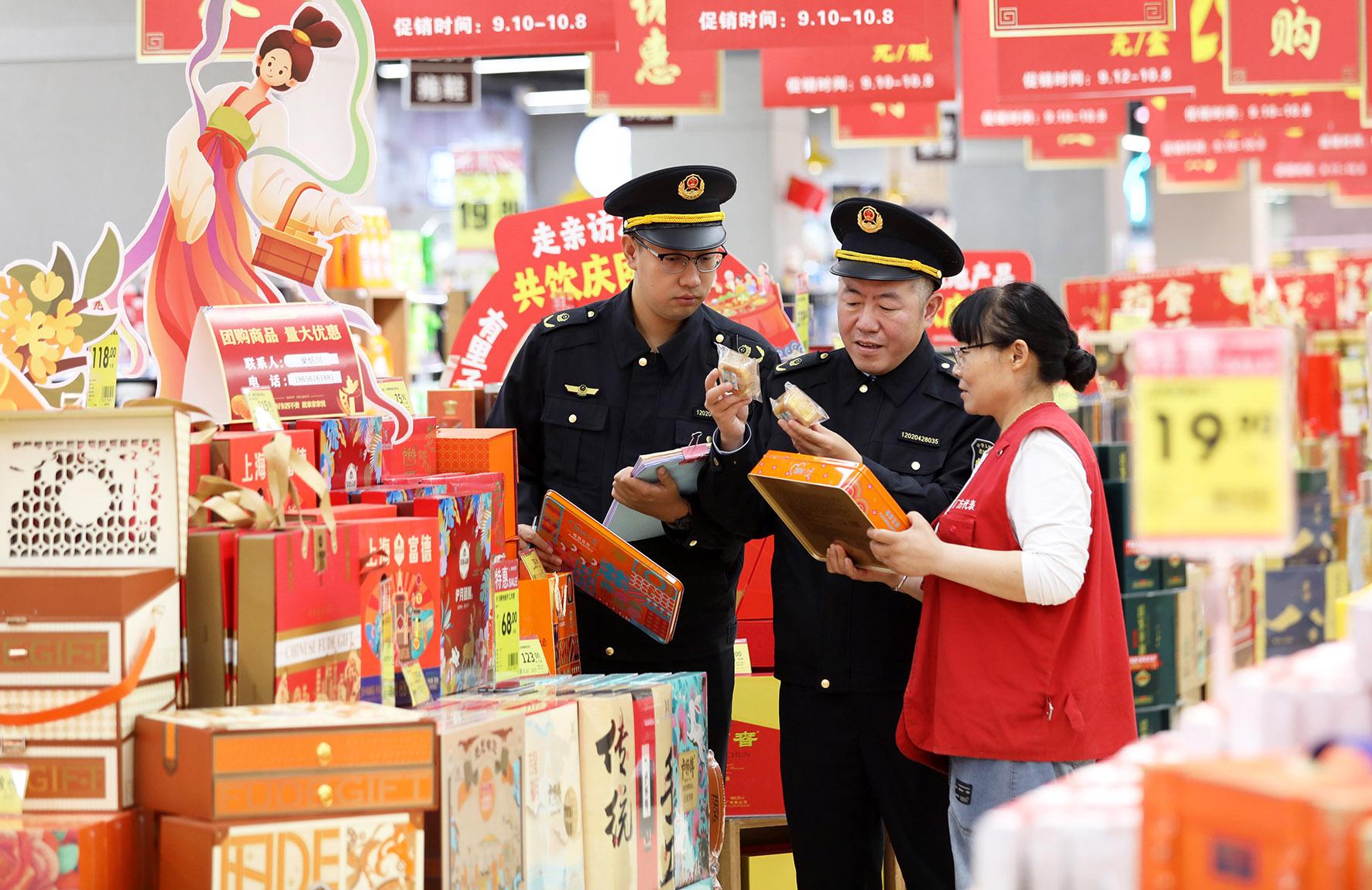 9月24日,安徽省淮北市相山區(qū)桓譚市場監(jiān)管所執(zhí)法人員在轄區(qū)進(jìn)行商品質(zhì)量檢查。國慶、中秋將至,淮北市相山區(qū)市場監(jiān)管部門組織執(zhí)法人員,對(duì)節(jié)前市場開展專項(xiàng)檢查。