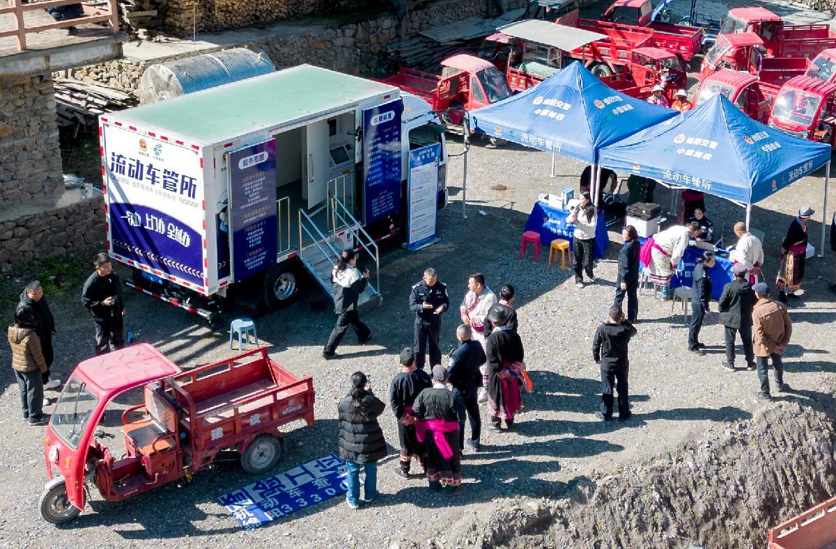 10月30日,四川省綿陽(yáng)市公安局交通警察支隊(duì)將“流動(dòng)車(chē)管所”開(kāi)進(jìn)平武縣白馬藏族鄉(xiāng)扒昔加古寨,為周邊群眾帶來(lái)家門(mén)口的車(chē)駕管服務(wù)。
