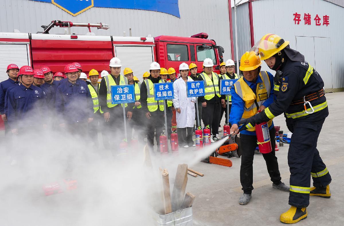 11月7日,江蘇省興化市消防救援大隊(duì)消防員指導(dǎo)鹽宜鐵路項(xiàng)目部工人正確使用滅火器。