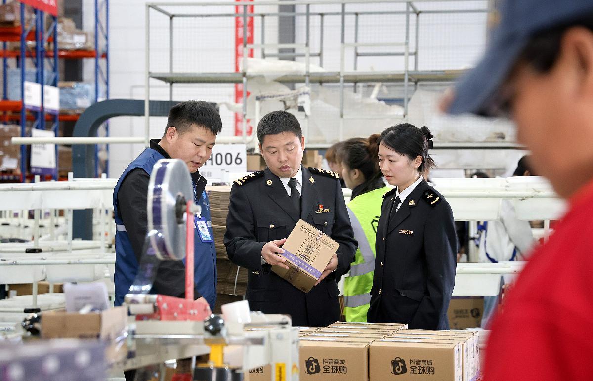 圖為11月10日,南通海關(guān)關(guān)員在南通綜合保稅區(qū)某公司跨境倉庫,現(xiàn)場查看打包發(fā)運(yùn)的包裹。