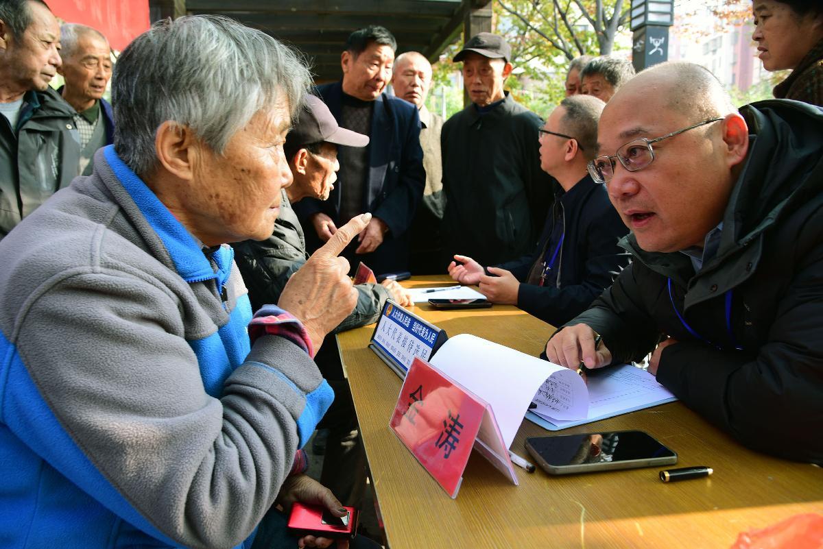 11月14日,在江蘇省鎮(zhèn)江市潤州區(qū)和平路街道新金江社區(qū),人大代表面對面聽取選民的意見和建議。當日,鎮(zhèn)江市開展“五級人大代表接待選民日”活動,各級人大代表分別走進村和社區(qū)接待選民,面對面傾聽民聲民意。