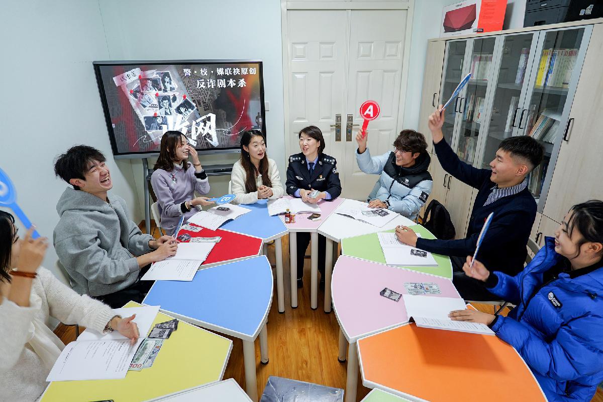 11月17日,山東省煙臺市公安局萊山分局民警在煙臺大學(xué)組織開展名為《收網(wǎng)》的劇本殺反詐宣傳,讓學(xué)生們通過角色扮演,在虛擬交鋒中錘煉現(xiàn)實防騙能力。