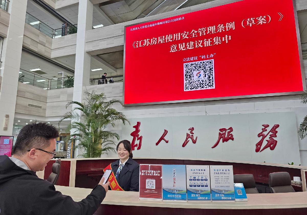 12月3日,在江蘇省南通市政務(wù)服務(wù)中心大廳,前來辦事的市民通過掃描“立法我參與”二維碼,對(duì)正在征求意見的《江蘇省房屋使用安全管理?xiàng)l例(草案)》提出修改完善建議。