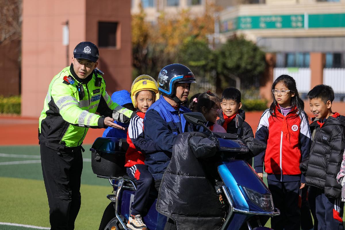 12月1日,山東省青島市公安局交通管理支隊(duì)李滄區(qū)大隊(duì)輔警在青島崇禮小學(xué)向?qū)W生講解如何安全騎乘電動(dòng)摩托車。