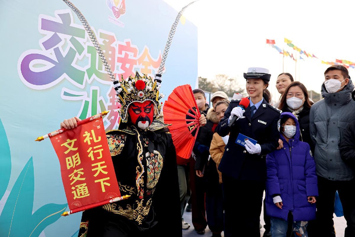 12月2日,在山東省棗莊市光明廣場“交通安全小舞臺(tái)”,棗莊市公安局市中分局交通管理大隊(duì)民警利用傳統(tǒng)“變臉”表演方式宣傳交通安全知識(shí)。
