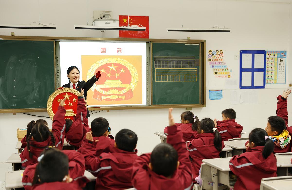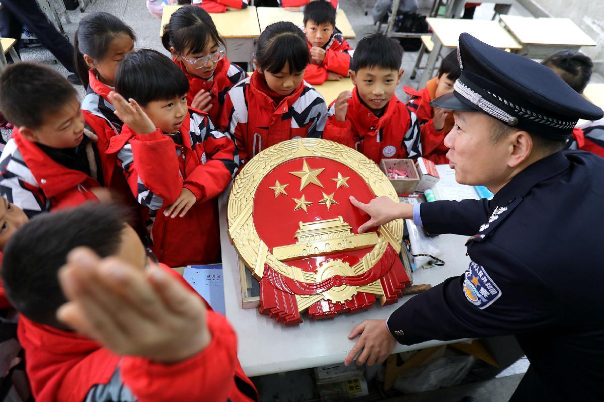 12月2日,在江蘇省連云港市墟溝小學(xué),連云港市公安局墟溝派出所民警為學(xué)生講解憲法知識(shí)。