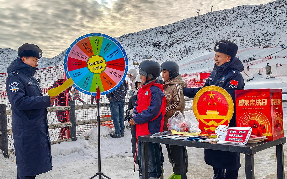 在第十二個(gè)國(guó)家憲法日來(lái)臨之際,12月1日,新疆阿勒泰邊境管理支隊(duì)阿熱勒托別邊境派出所來(lái)到阿勒泰地區(qū)青河縣“狼山國(guó)際滑雪場(chǎng)”開(kāi)展憲法宣傳。