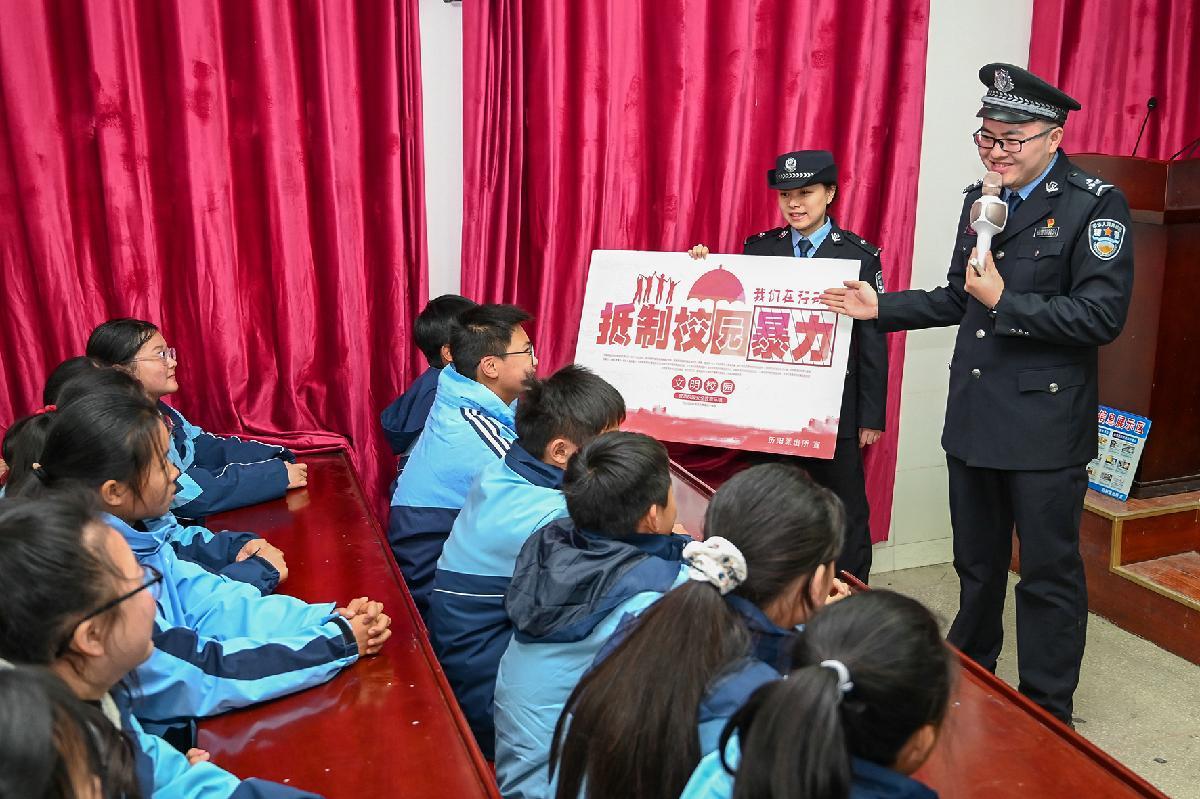 12月22日,安徽省馬鞍山市和縣公安局民輔警在功橋中學向?qū)W生講解預防校園欺凌知識。