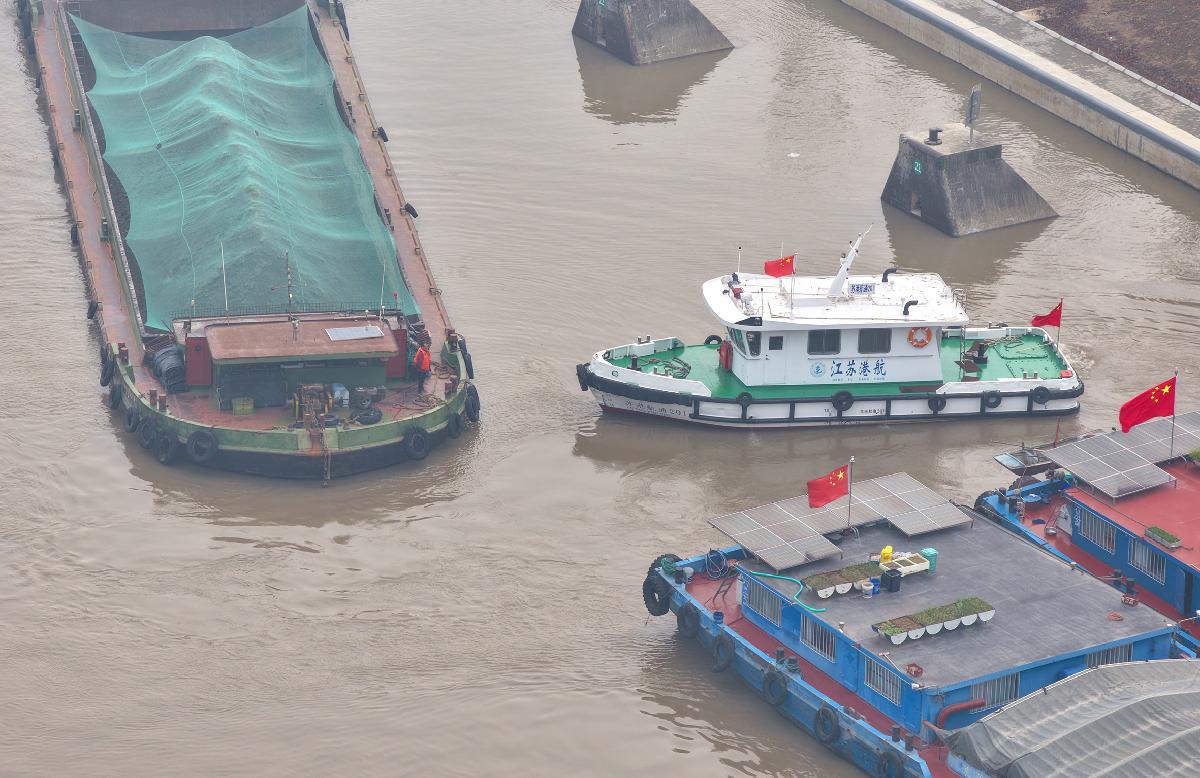 1月6日,江蘇省南通市港航事業(yè)發(fā)展中心工作艇在南通市崇川區(qū)通呂運(yùn)河維持秩序,確保大霧天氣運(yùn)河貨物運(yùn)輸安全有序。