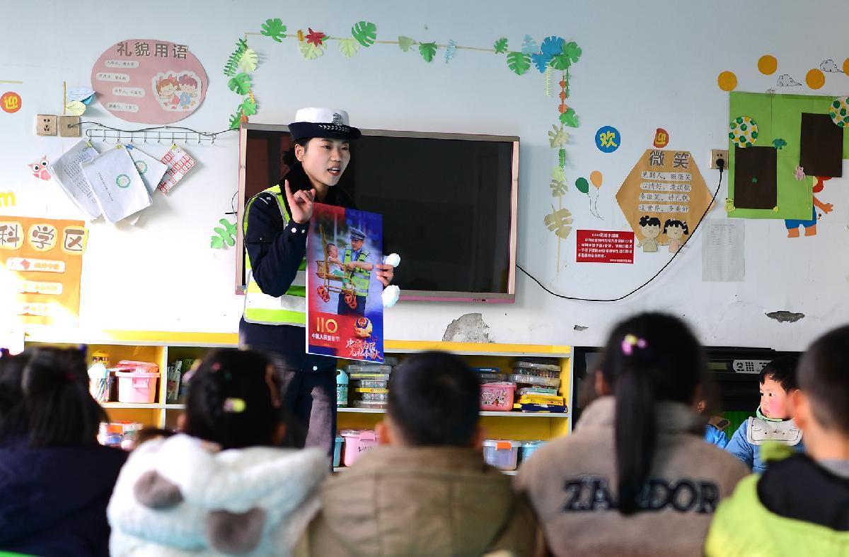 1月8日,第六個中國人民警察節(jié)前夕,安徽省巢湖市公安局交管大隊(duì)民警走進(jìn)轄區(qū)幼兒園,為小朋友們講解“中國人民警察節(jié)”的由來及道路交通安全知識。