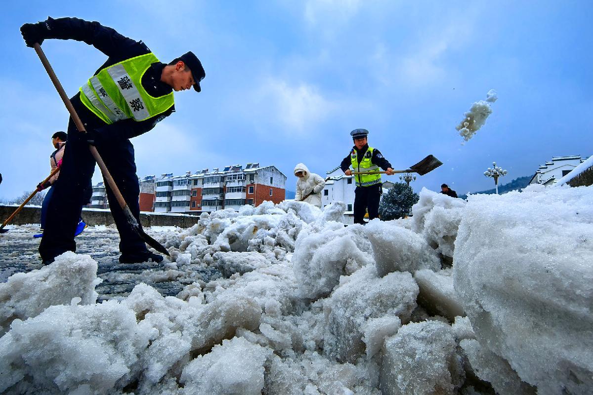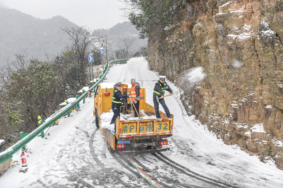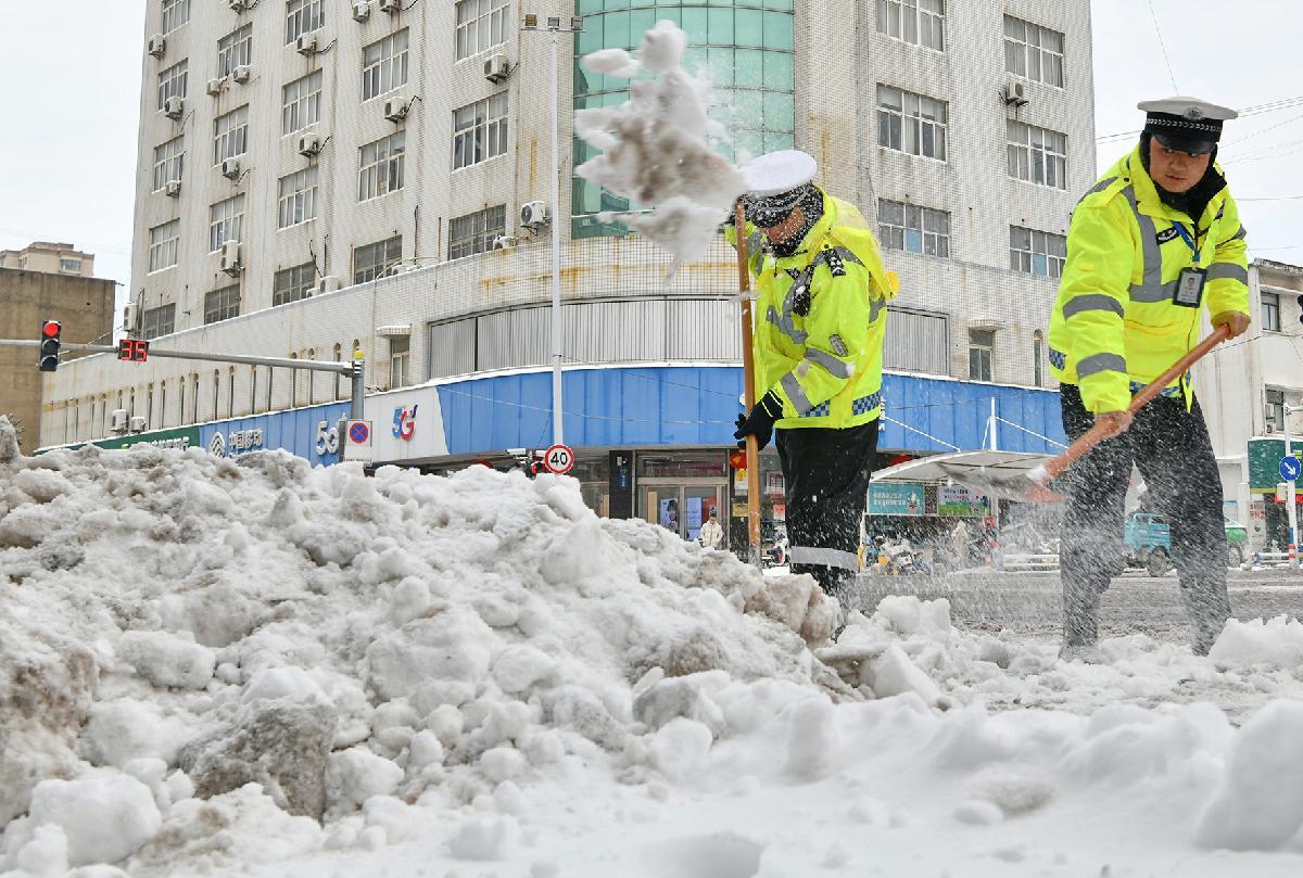 1月20日,安徽省阜南縣大范圍降雪。阜南縣公安、交通運輸、城市管理等多部門聯(lián)動保障交通暢通。