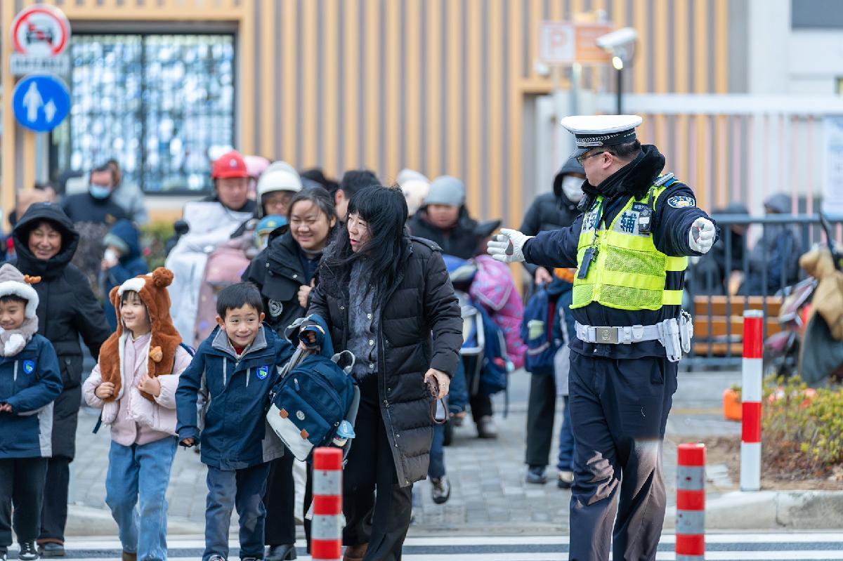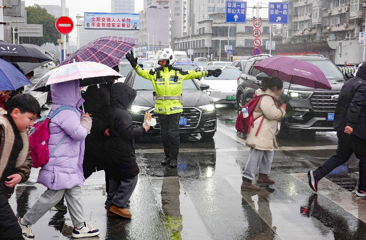 1月19日,安徽省銅陵市雨雪低溫天氣來襲。銅陵市公安局交管支隊立即啟動應急預案,增派中小學校“護學崗”警力,全力守護學生出行安全。
