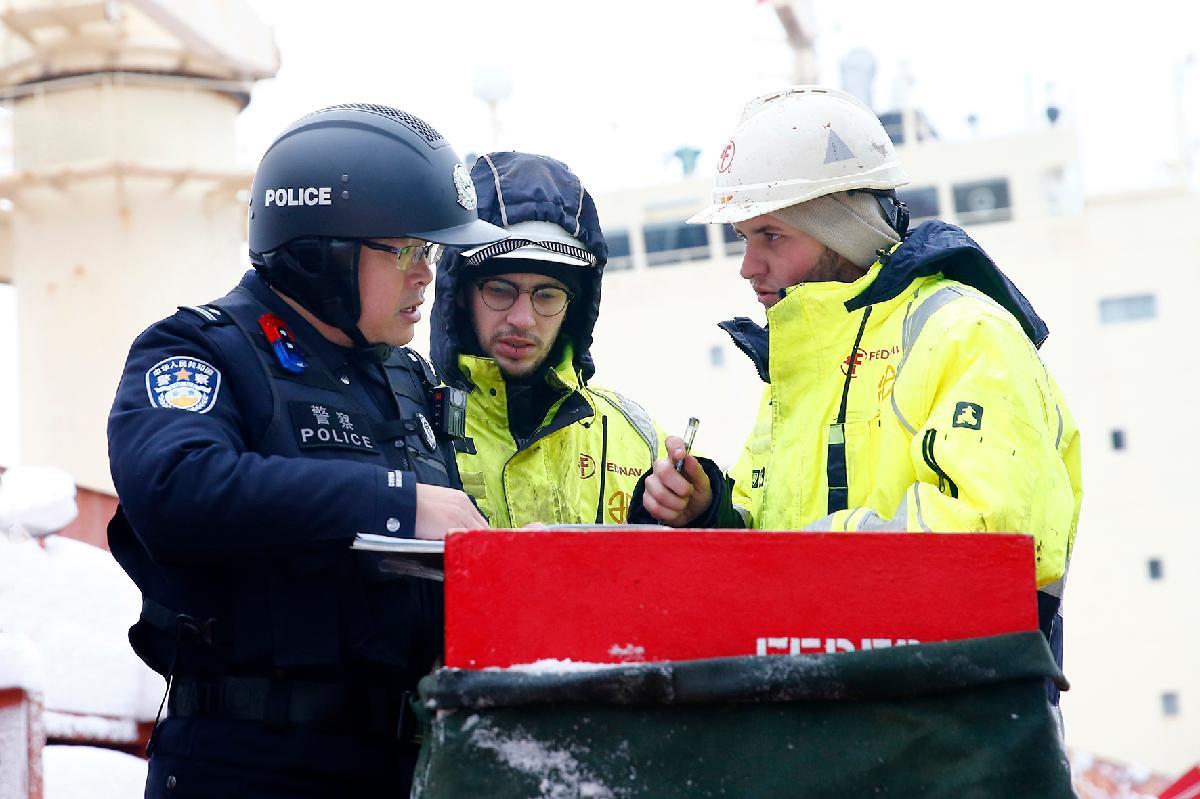 1月20日,南京港邊檢站執(zhí)勤民警登上??吭谛律赘蹍^(qū)401泊位的馬紹爾群島籍“高克斯”輪,向外籍船員進行冰雪天氣安全作業(yè)提醒。