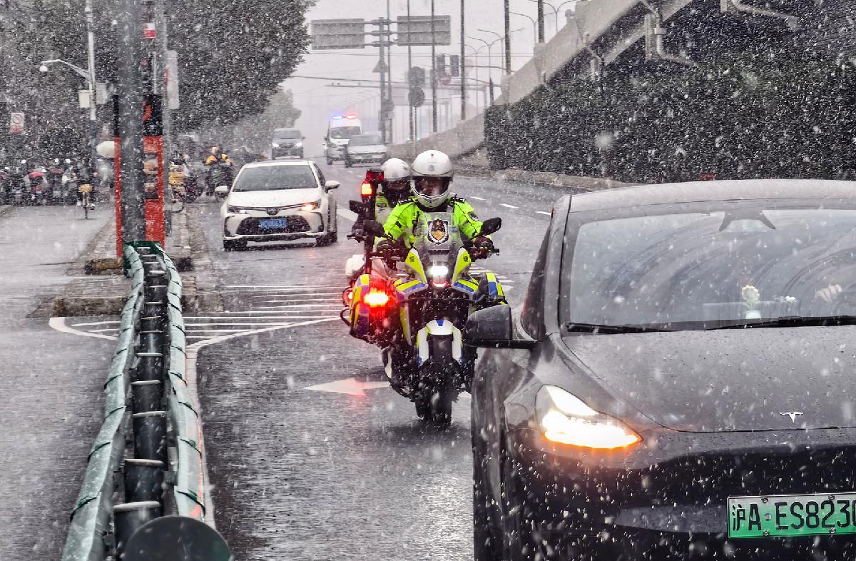 1月20日清晨,申城迎來雨雪天氣。上海市公安局閔行分局交管支隊顯性派警,在重點區(qū)域疏導交通,為民紓困。