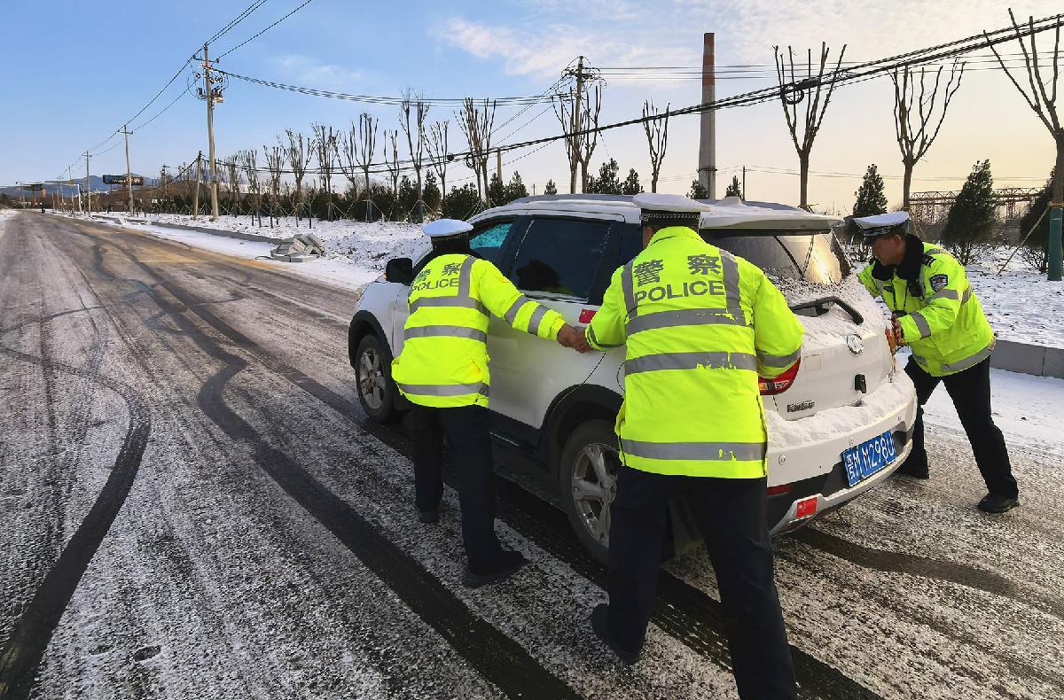 1月20日,安徽省馬鞍山市含山縣公安局民警在冰雪路面疏導交通,保障群眾安全出行。
