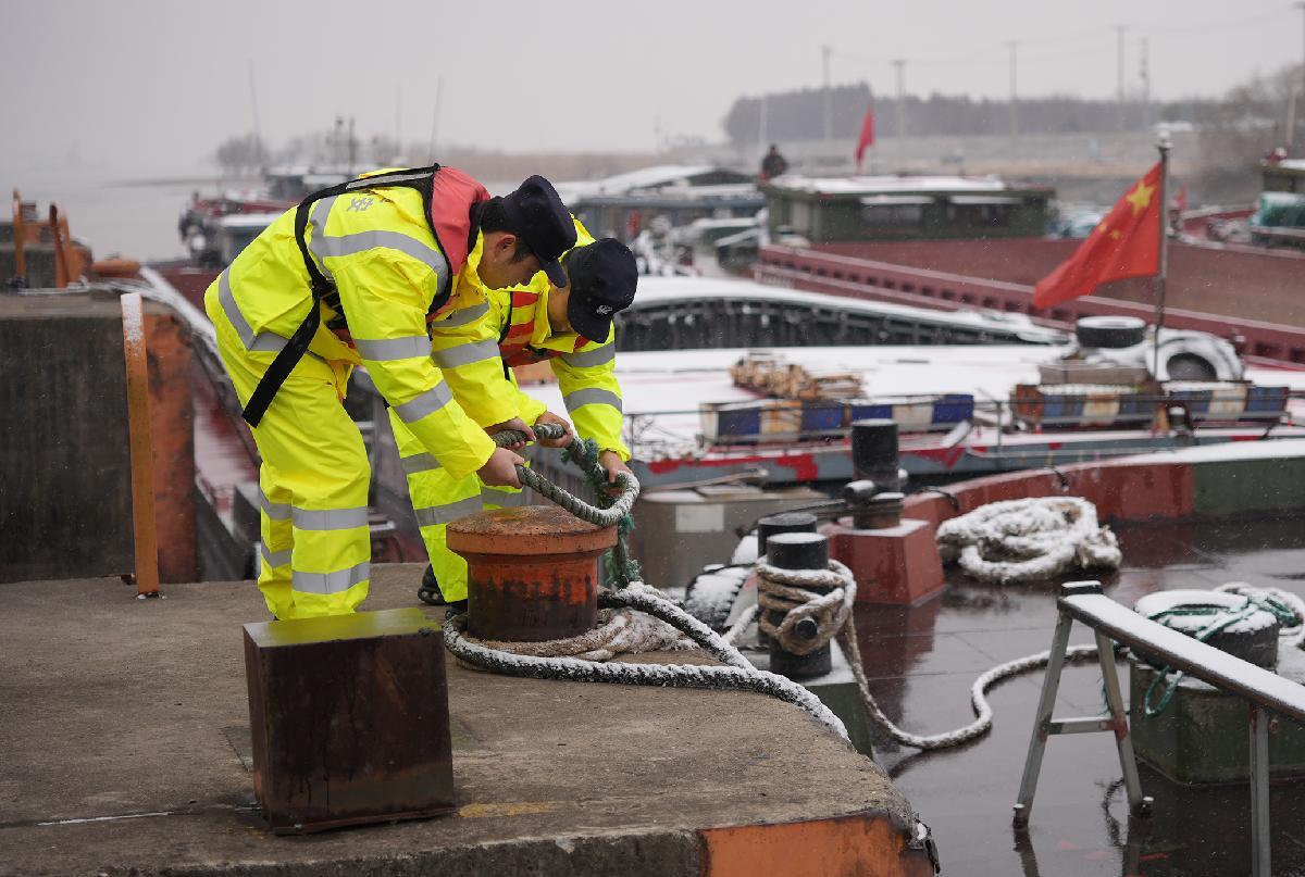 1月20日,長江航運公安局南通分局海門派出所民警對南通海門滸通河河閘、新江海河河閘外側(cè)長江段水域待過閘船舶開展雨雪天氣專項安全檢查。