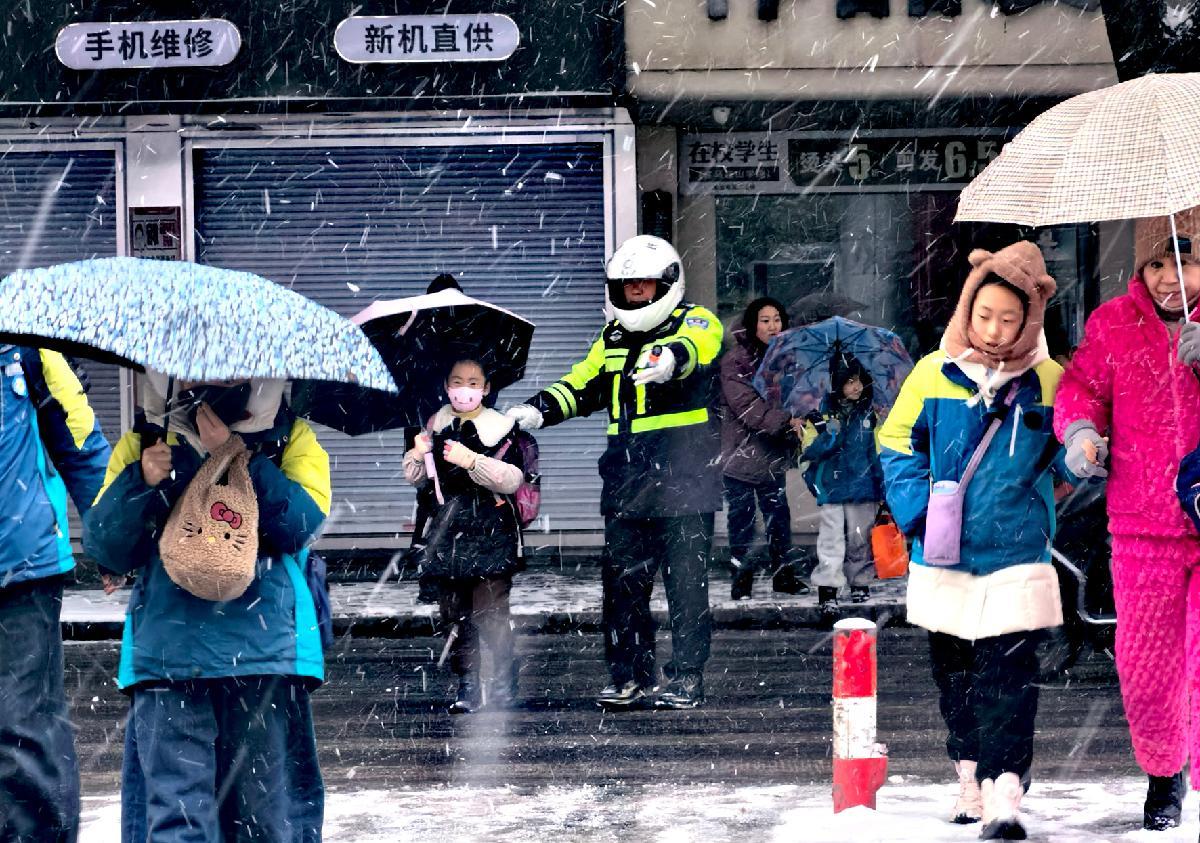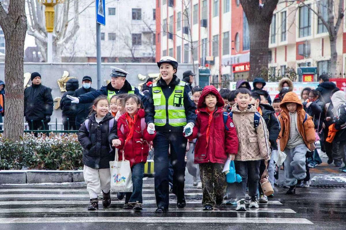 1月19日,山東省滕州市公安局交通管理大隊以雪為令,依托“護學崗”,為雪天出行的廣大師生保駕護航。