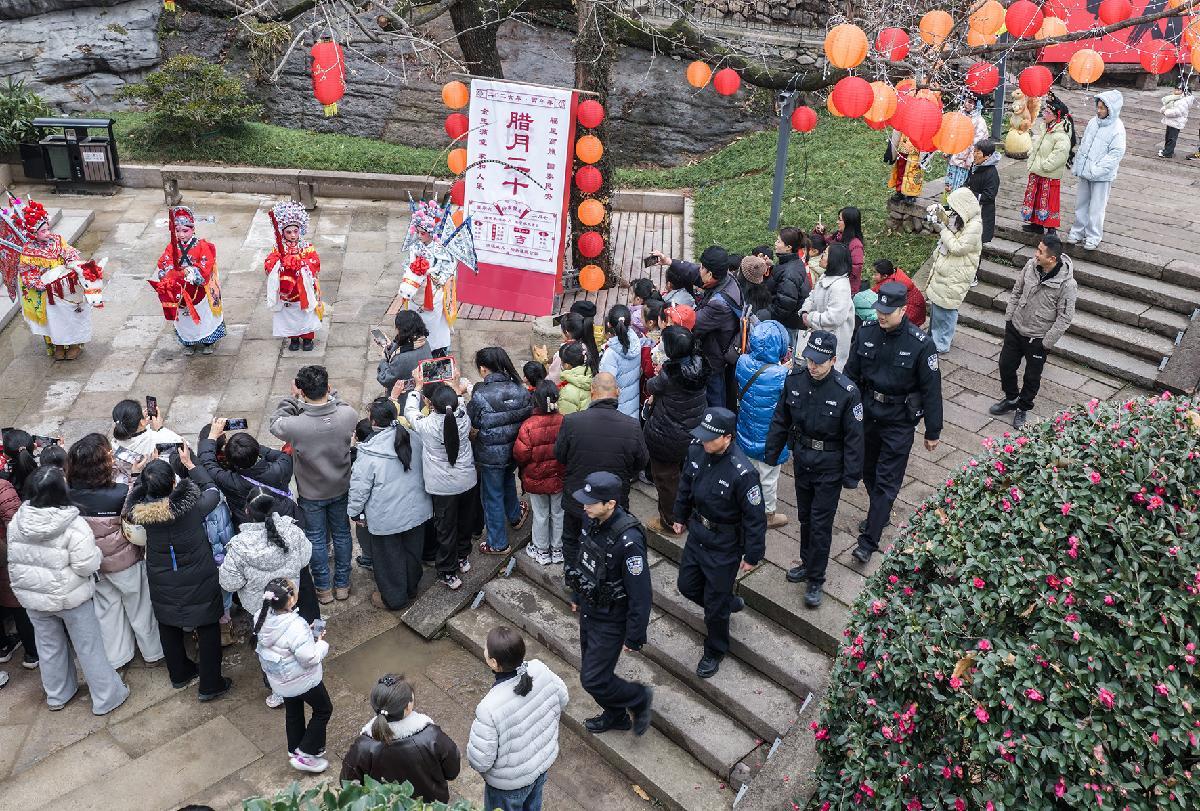2月7日,浙江省武義縣公安局壺山派出所民輔警在轄區(qū)年俗文化節(jié)活動現(xiàn)場巡邏執(zhí)勤,守護(hù)鄉(xiāng)村濃濃的年味。