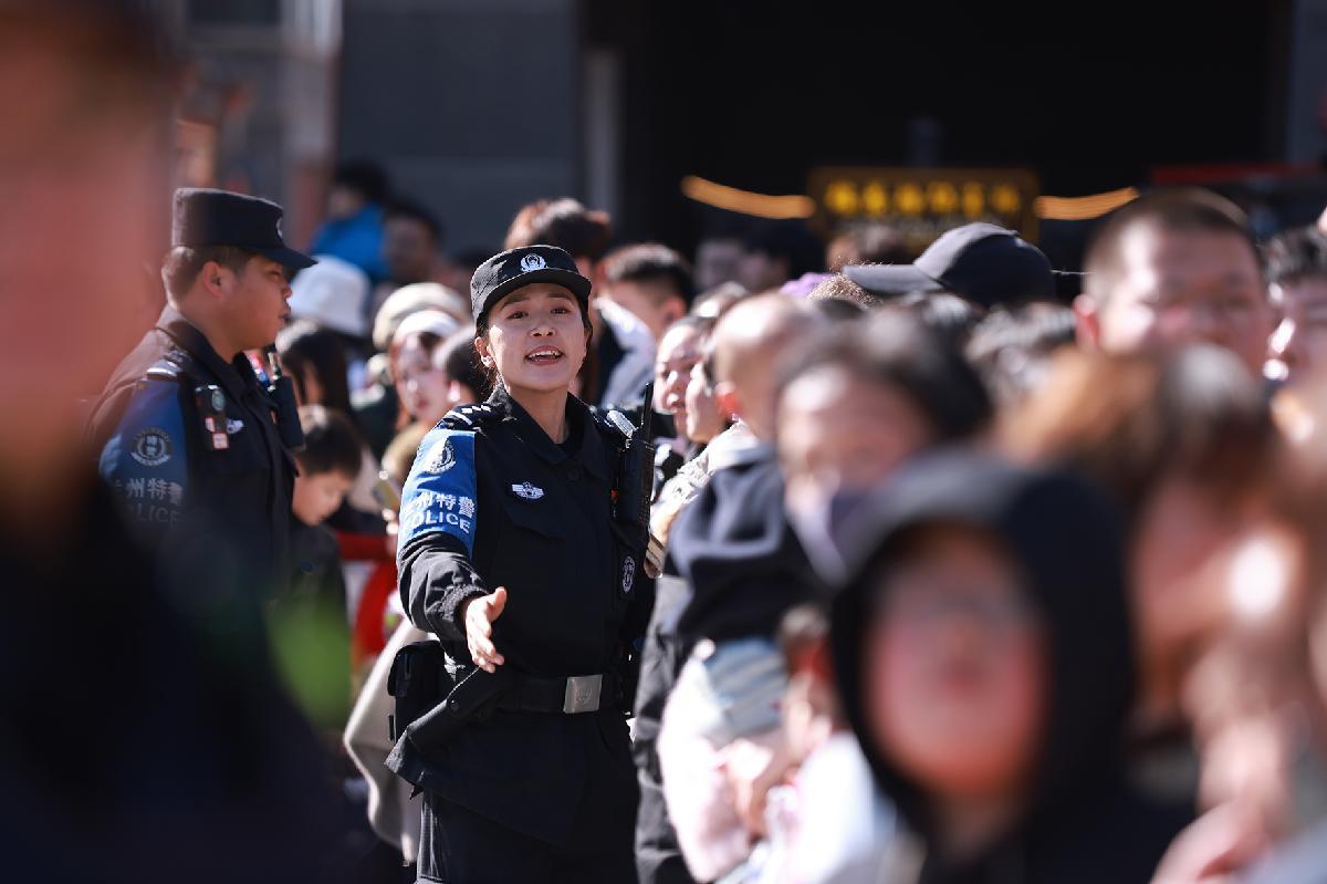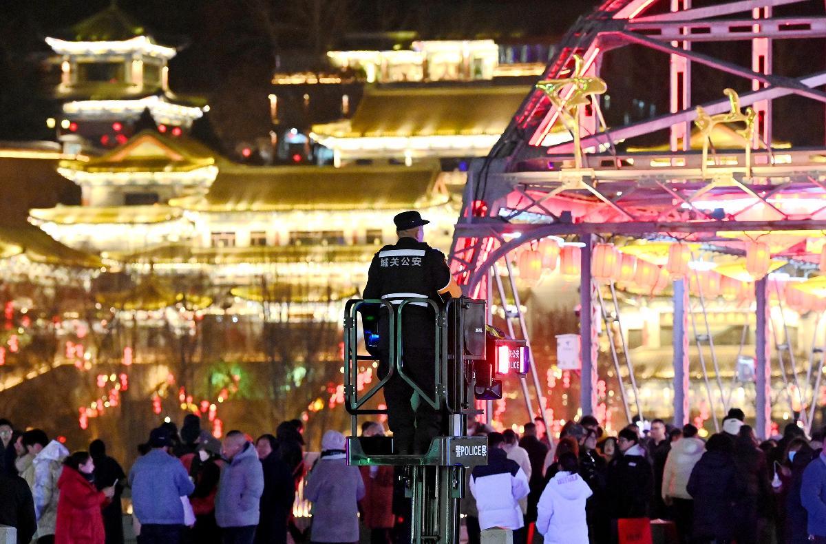 2月20日,甘肅省蘭州市公安局民輔警在蘭州老街非遺踩高蹺表演現(xiàn)場疏導(dǎo)客流、維護(hù)秩序。