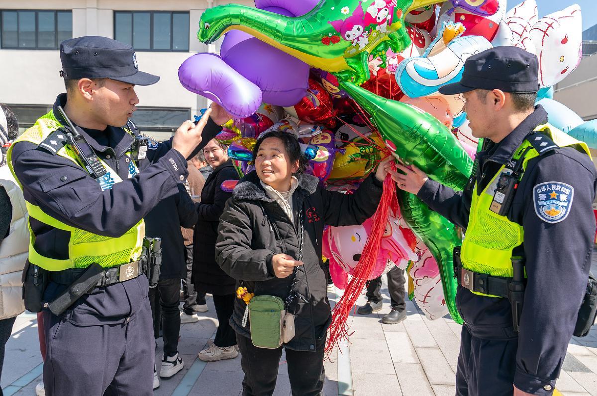 2月22日,上海市公安局崇明分局汲浜派出所民警在嘉年華活動現(xiàn)場提醒賣氣球的商戶注意防火安全。
