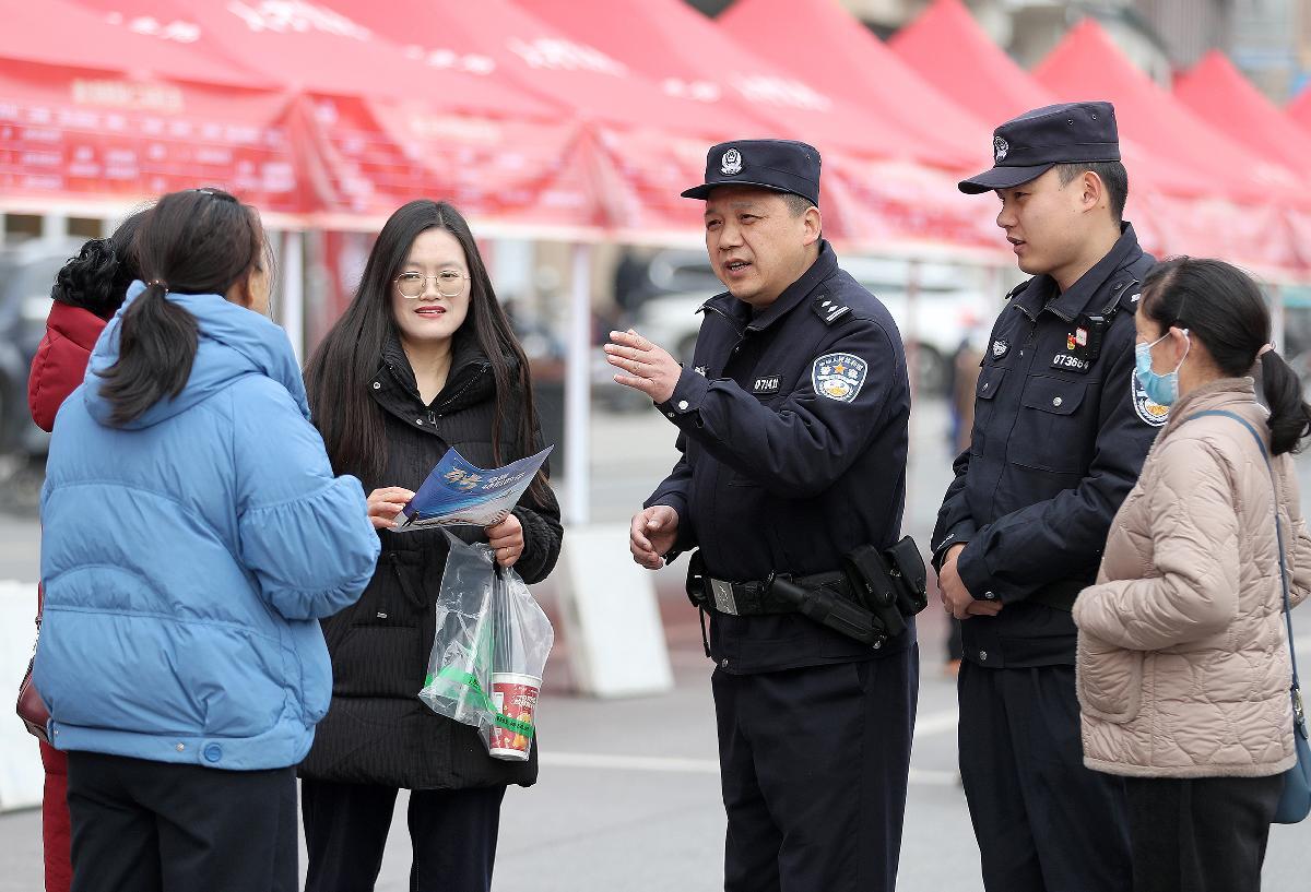 2月25日,湖北省沙洋縣濱江新區(qū)“春風(fēng)行動(dòng)”專場(chǎng)招聘會(huì)上,沙洋縣公安局洪嶺派出所民警現(xiàn)場(chǎng)為求職者拆解“高薪誘惑”“先交費(fèi)后上崗”等招聘騙局套路。