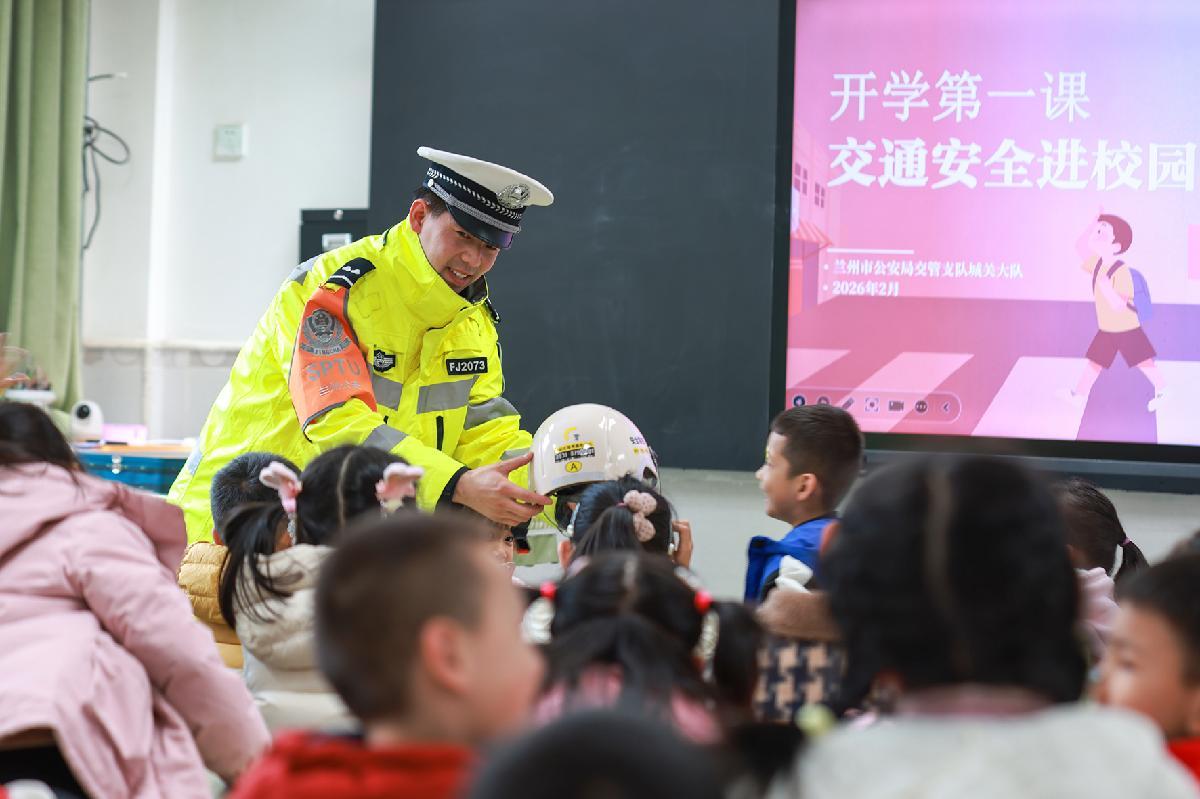 2月25日,甘肅省蘭州市公安局交管支隊城關(guān)大隊輔警在城關(guān)區(qū)水車園小學(xué)民勤街分校,為學(xué)生們講解交通安全知識。