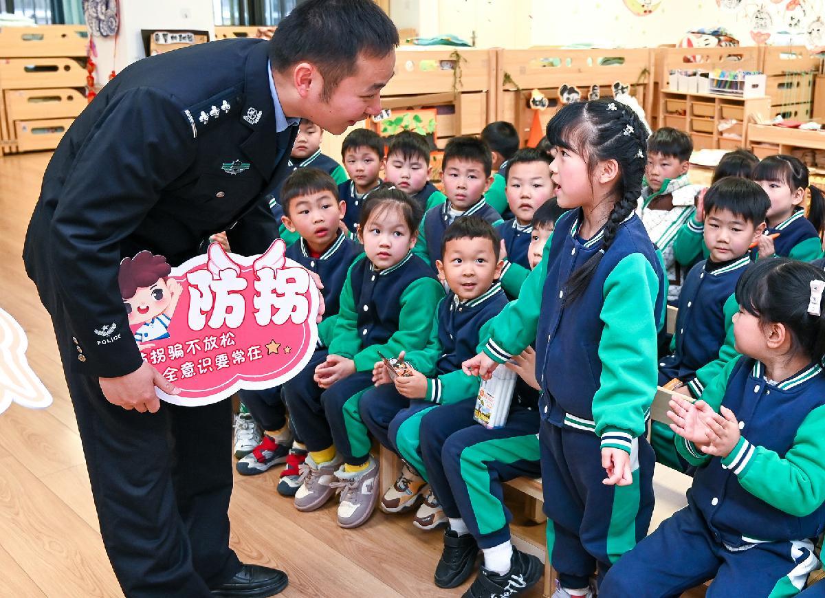 3月5日,安徽省馬鞍山市和縣公安局民警在歷陽鎮(zhèn)幼兒園與小朋友們互動(dòng)交流,宣講防拐騙、交通安全、消防安全等知識(shí)。