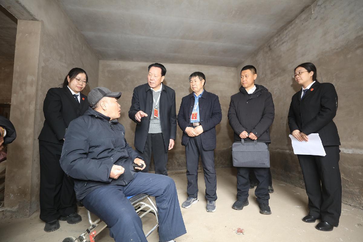 圖為法官與人大代表現(xiàn)場(chǎng)聽取當(dāng)事人訴求。