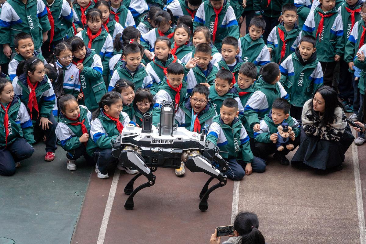 圖為警用機器狗與同學(xué)們進行互動。