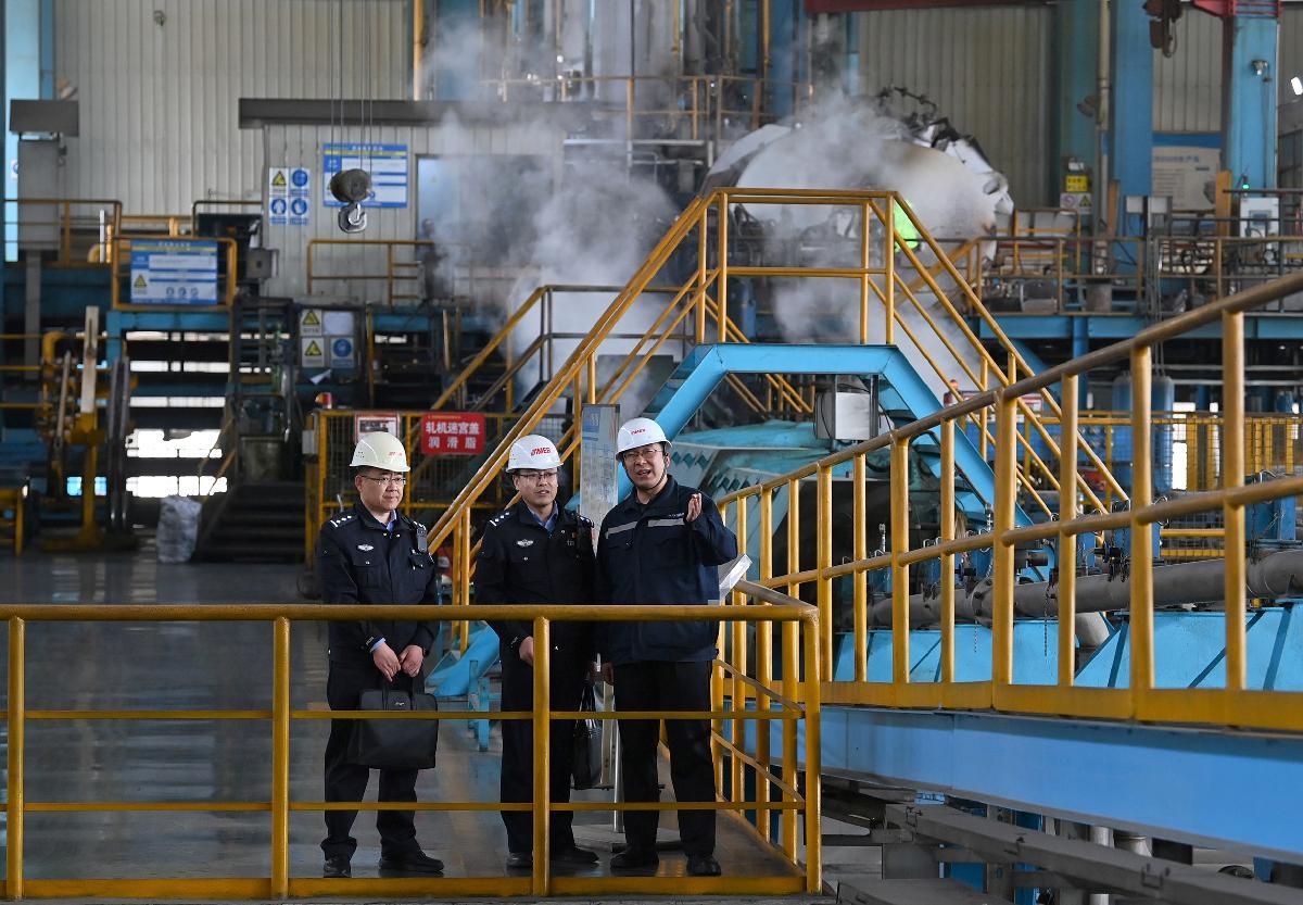 圖為民輔警了解企業(yè)內部安全防范措施。
