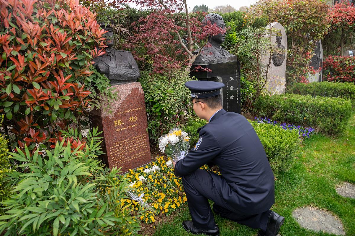 3月27日,安徽省合肥市公安局蜀山分局組織青年民警在大蜀山文化陵園開(kāi)展清明祭公安英烈活動(dòng),公安英模陳彬之子、民警陳文琛祭奠父親。