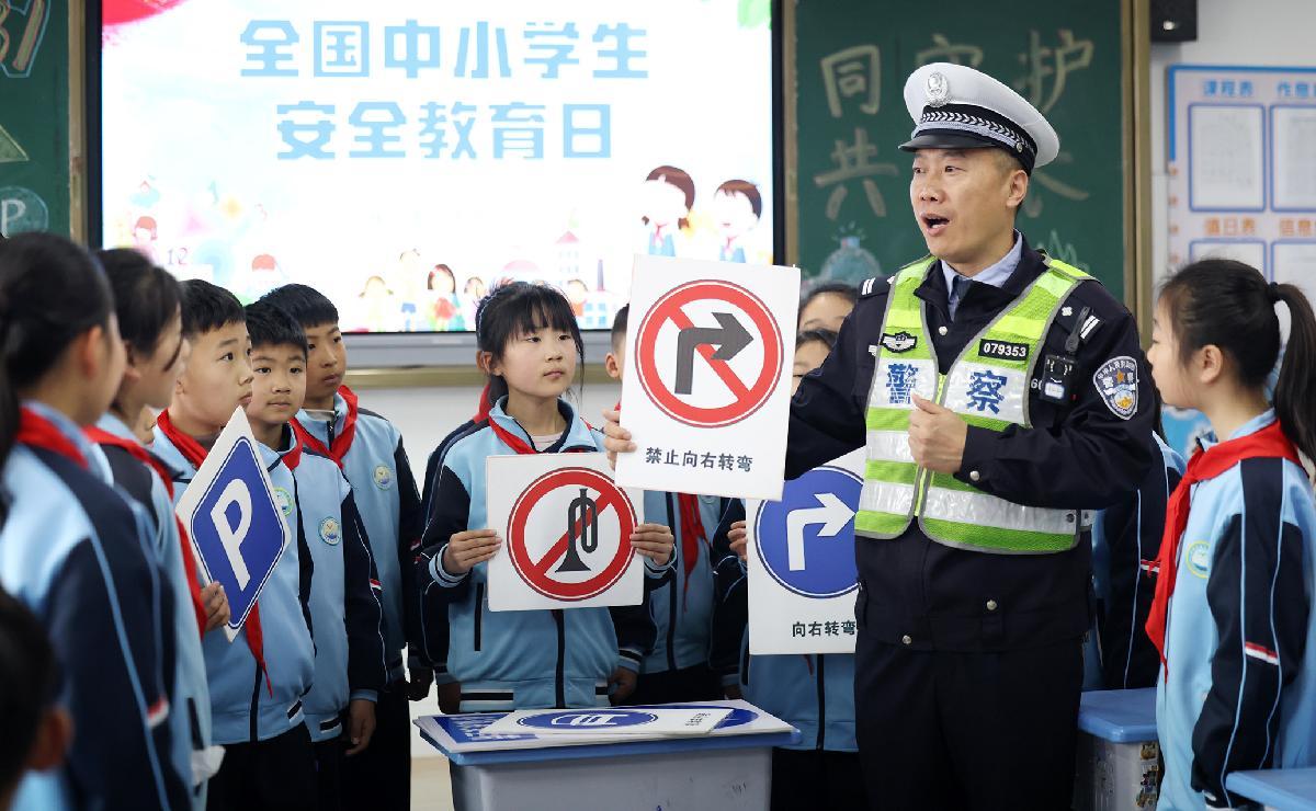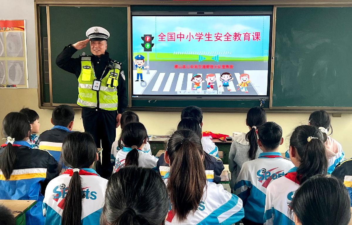 3月30日,在山東省臨沂市郯城縣第三實(shí)驗(yàn)小學(xué),郯城縣公安局交通管理大隊(duì)民警為學(xué)生講解交通安全知識。