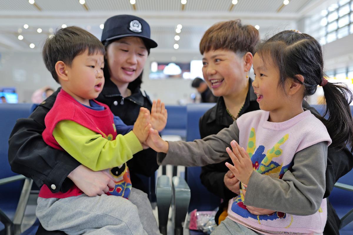 4月7日,杭州鐵路公安處嵊州新昌站派出所民警主動幫助一對雙胞胎的奶奶耐心安撫哭鬧孩子的情緒,讓旅途多了一份安心與溫情。