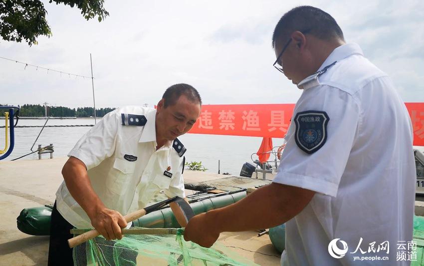 昆明市滇池管理局漁業(yè)行政執(zhí)法處工作人員正在銷毀收繳的違禁漁具。(人民網(wǎng) 虎遵會(huì) 攝)