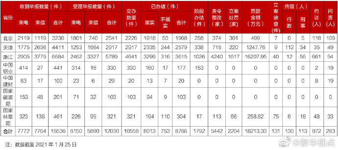 生態(tài)環(huán)境部29日通報,截至2021年1月25日,第二輪第二批中央生態(tài)環(huán)保督察受理的群眾舉報已辦結8766件,處罰金額約18213.33萬元,立案偵查131件,行政拘留130人,刑事拘留113人,約談872人,問責283人。(記者高敬,圖片來源:生態(tài)環(huán)境部)