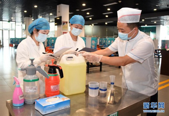 8月9日,在北京交通大學學生第二食堂,校醫(yī)院醫(yī)護人員(左、中)指導食堂工作人員進行消毒工作。