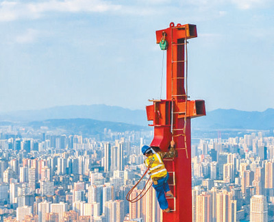 施工人員在重慶陸海國際中心項目主塔樓樓頂進(jìn)行施工作業(yè)。